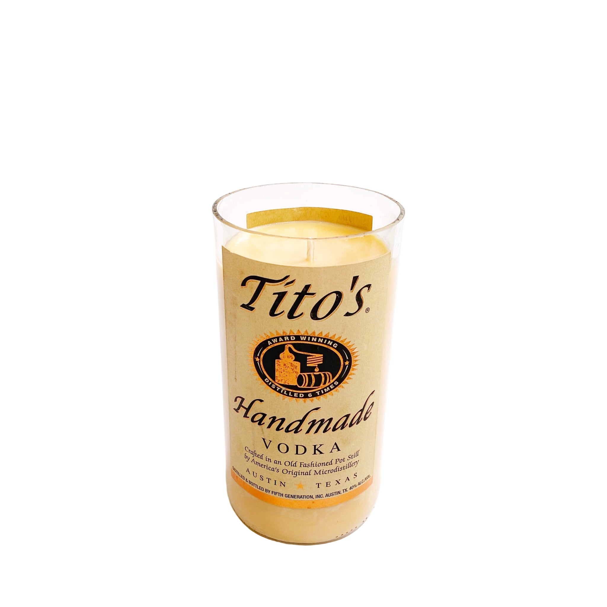 Tito’s Bottle Candles are handcrafted from authentic up-cycled liquor bottles, giving new life to original Tito’s Vodka bottles and transforming them into beautiful, long-lasting soy candles. Each piece is sustainably repurposed, sanded smooth by hand, and filled with premium scented soy wax for an elevated, eco-friendly burn.